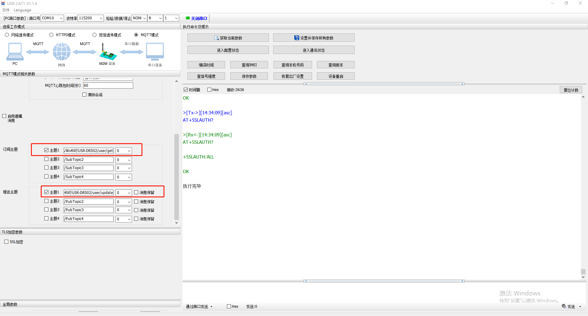 將訂閱的主題/i4u4VIKvRXf/USR-DR502/user/get填寫到USR-DR502訂閱主題配置中去;