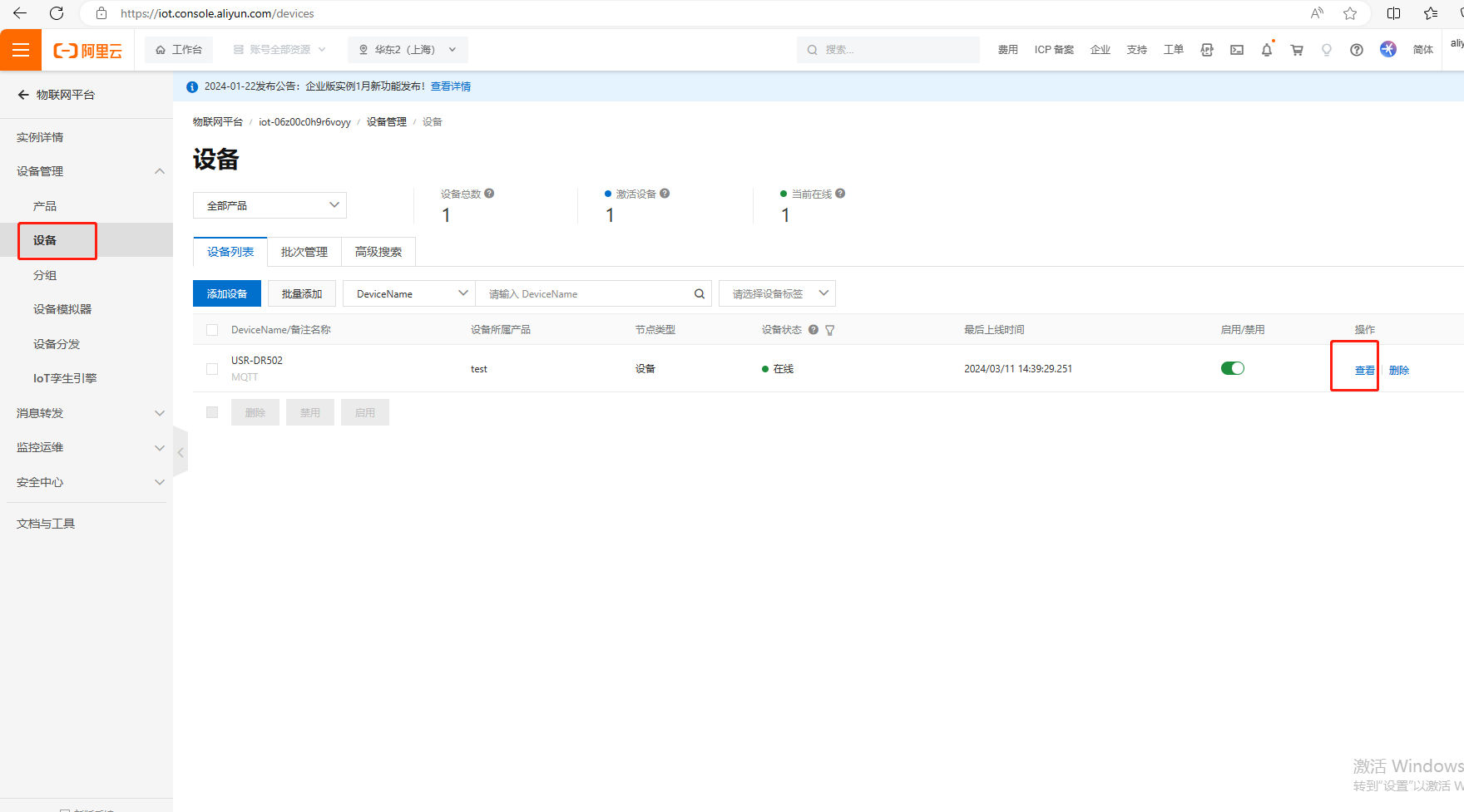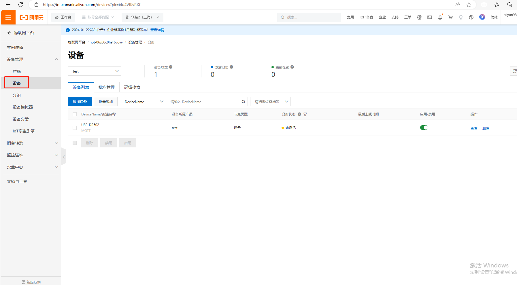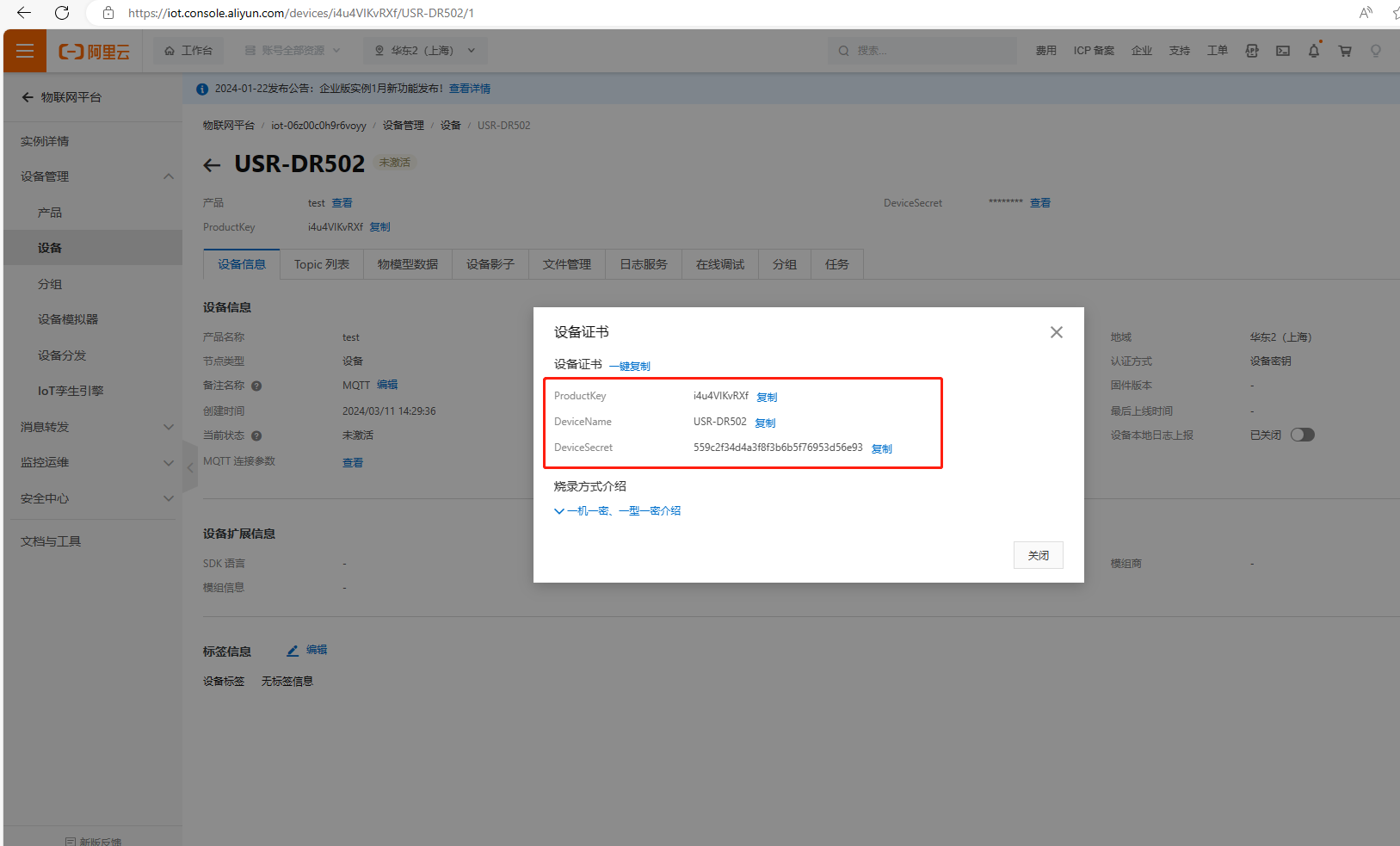 (2)添加完設(shè)備,如下圖展示,設(shè)備狀態(tài)是未激活,等設(shè)置完USR-DR502的MQTT連接阿里云參數(shù)之后,設(shè)備狀態(tài)才顯示在線。
