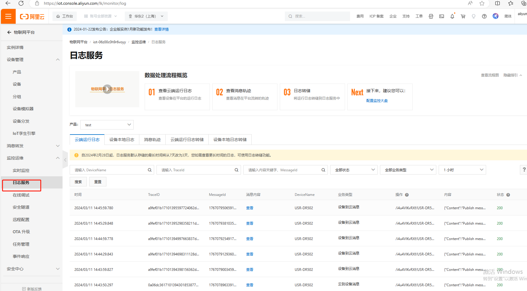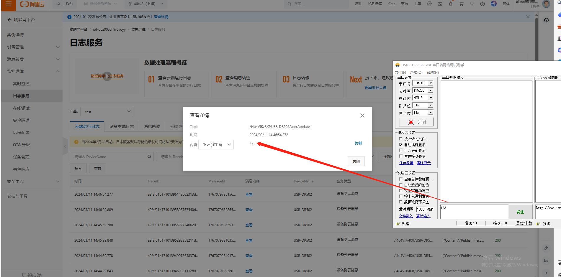 (2)USR-DR502使用串口助手發(fā)送數(shù)據(jù)123,發(fā)送完成之后,我們在阿里云平臺可以通過日志服務(wù),點擊查看,看到USR-DR502串口發(fā)到阿里云的數(shù)據(jù)123。