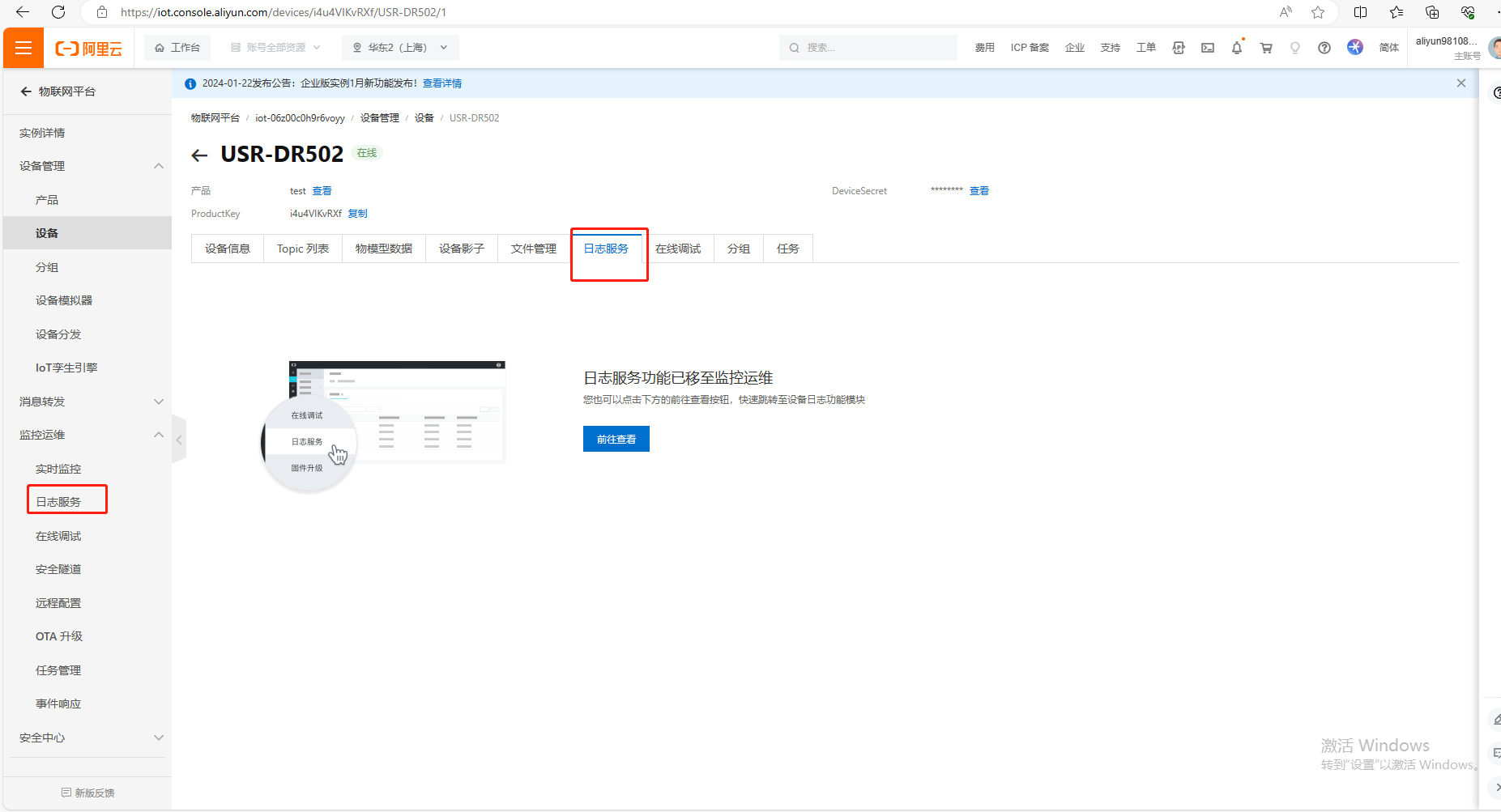 (1)點擊設(shè)備,點擊日志服務(wù)