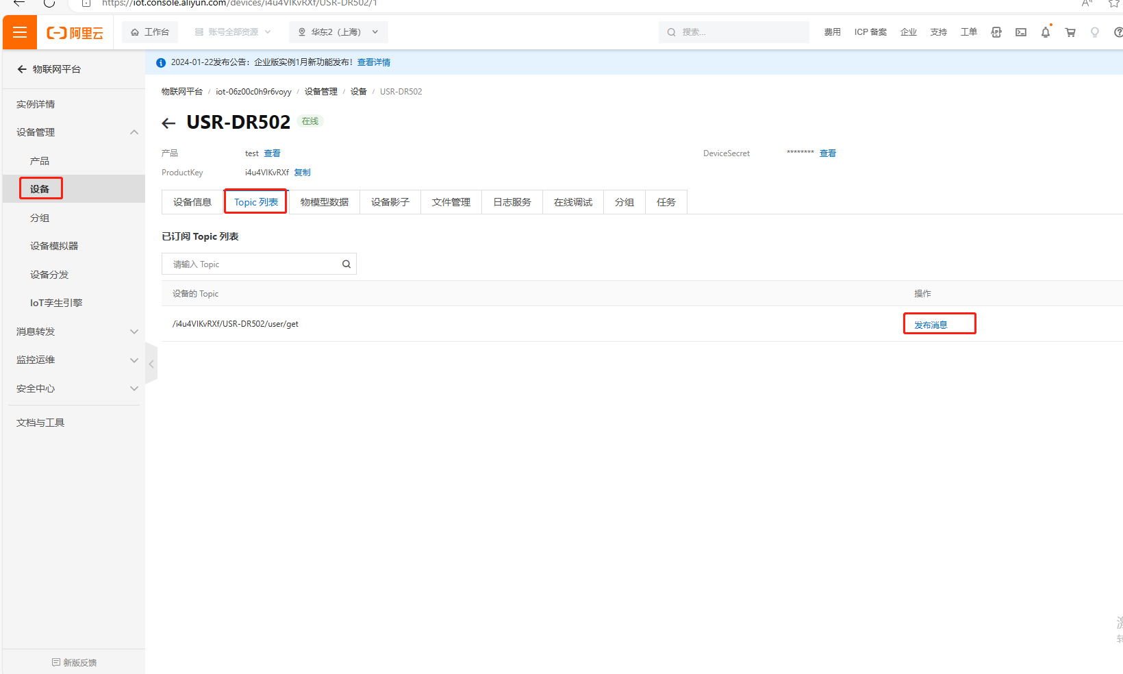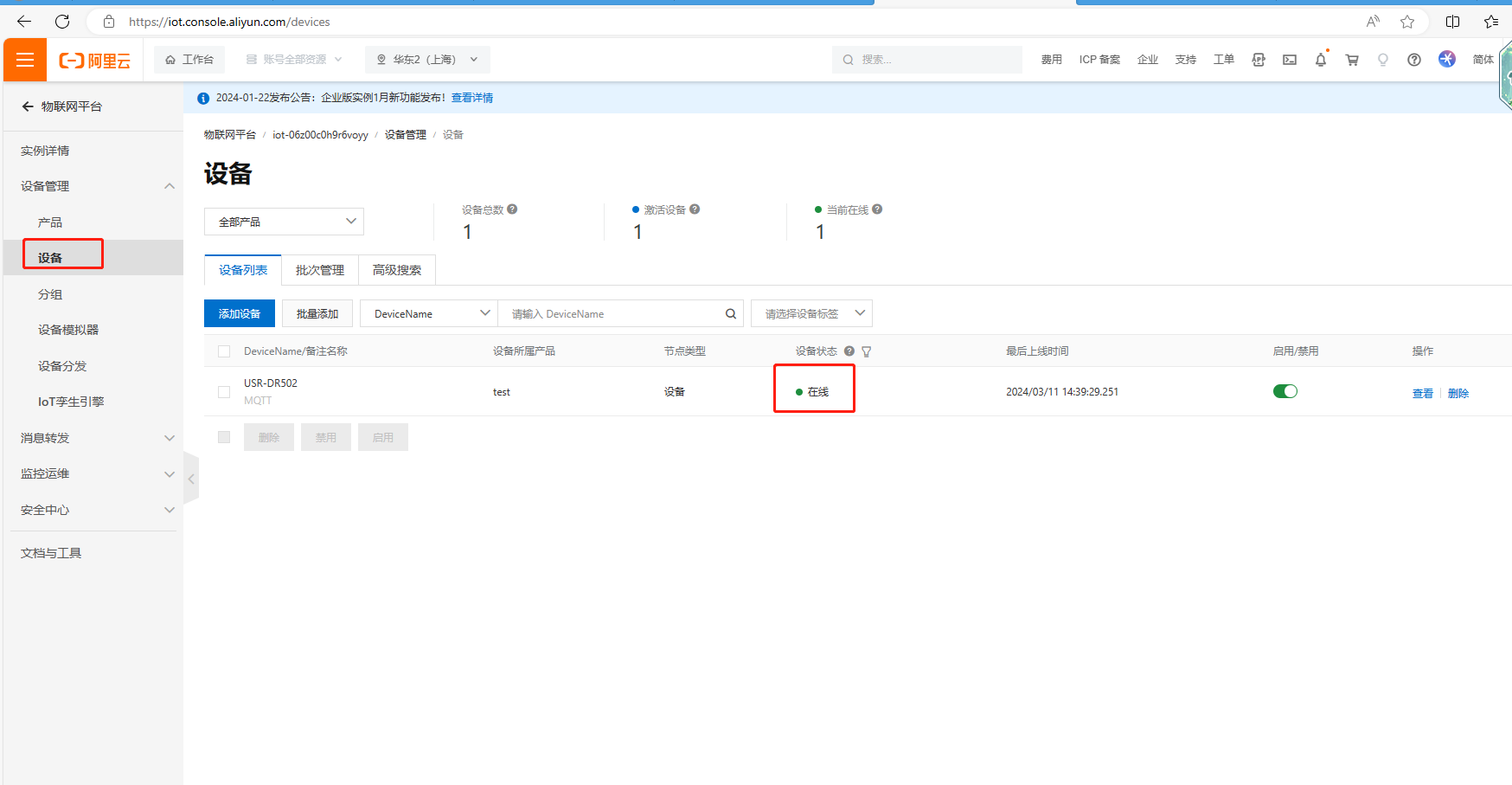 USR-DR502 設(shè)置完MQTT連接阿里云參數(shù),聯(lián)網(wǎng)正常,在阿里云平臺可以看到設(shè)備狀態(tài)是在線。