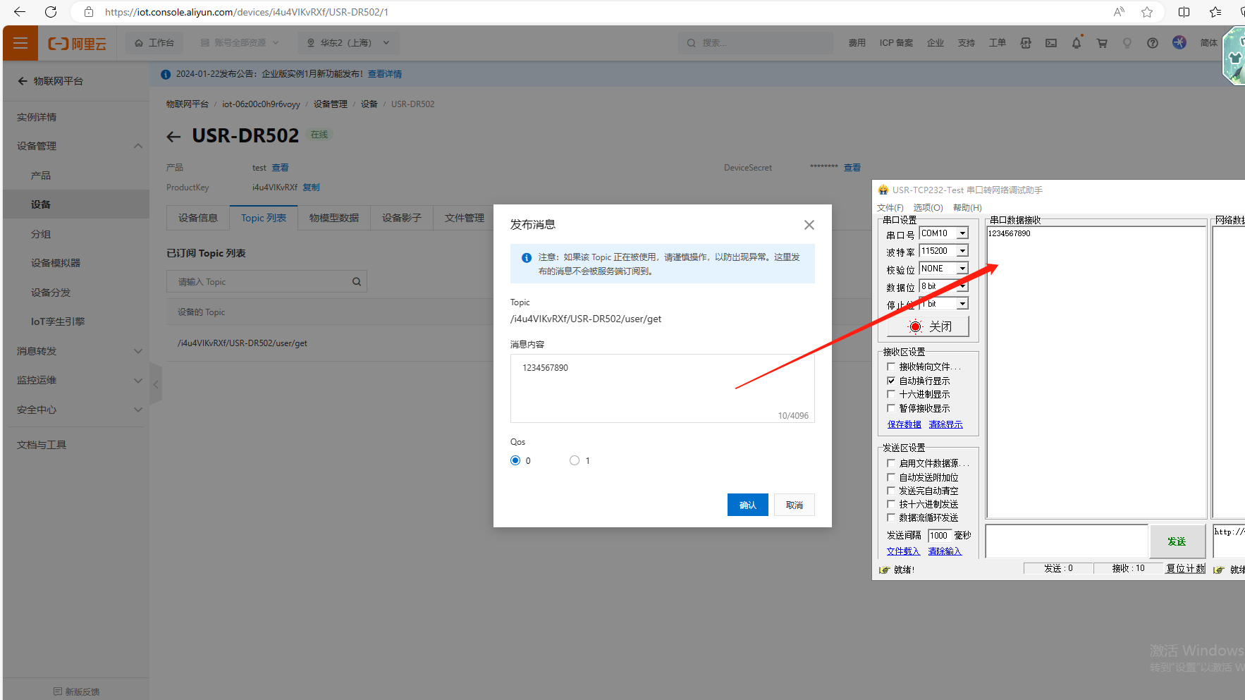 (3)使用阿里云平臺發(fā)布的消息1234567890,被USR-DR502訂閱到,并通過USR-DR502串口發(fā)給串口端,串口助手接收到阿里云下發(fā)的數(shù)據(jù)1234567890。