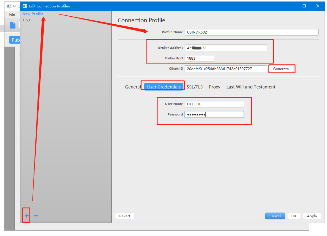 (4)Client ID(客戶端ID)可以點(diǎn)擊后面的Generate自動創(chuàng)建,注意和USR-DR502的客戶端ID不要一樣,如果相同會沖突。