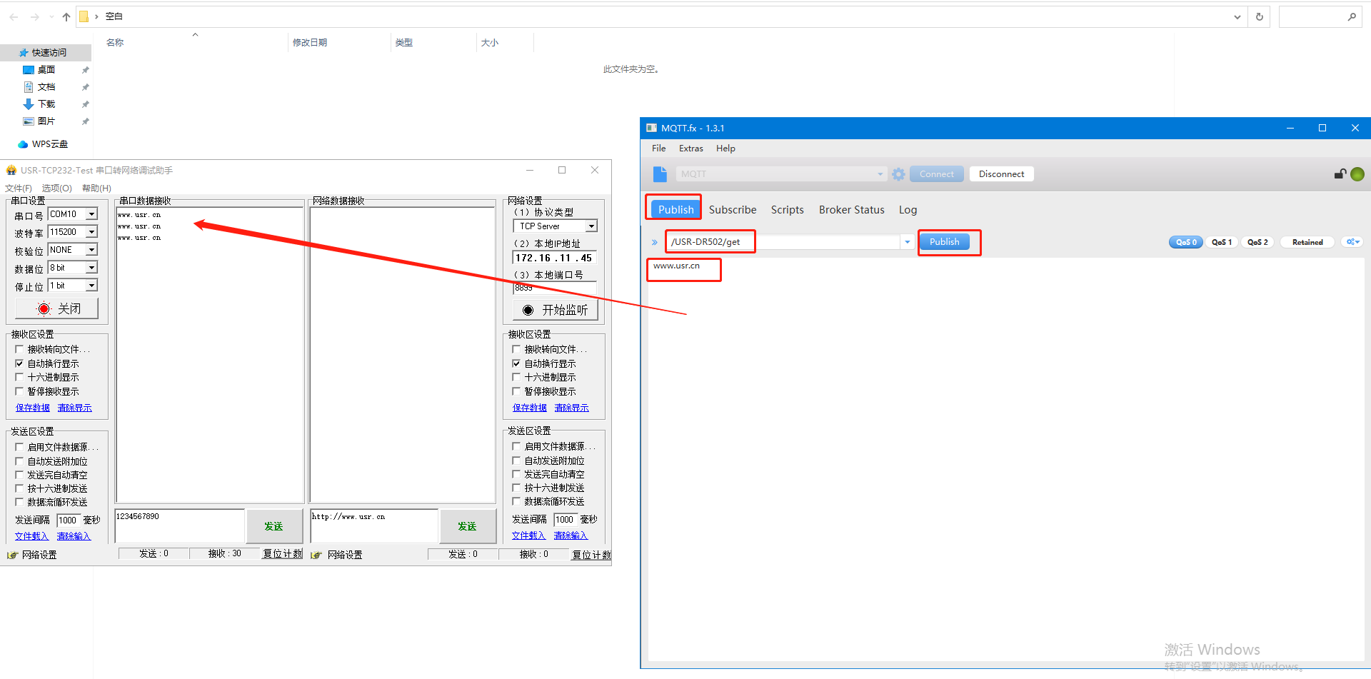 (2)MQTT.fx軟件點(diǎn)擊Publish,輸入/USR-DR502/get,在下面的發(fā)送框輸入數(shù)據(jù)www.xyglz.cn,點(diǎn)擊Publish發(fā)送給USR-DR502串口,串口助手接收數(shù)據(jù)www.xyglz.cn