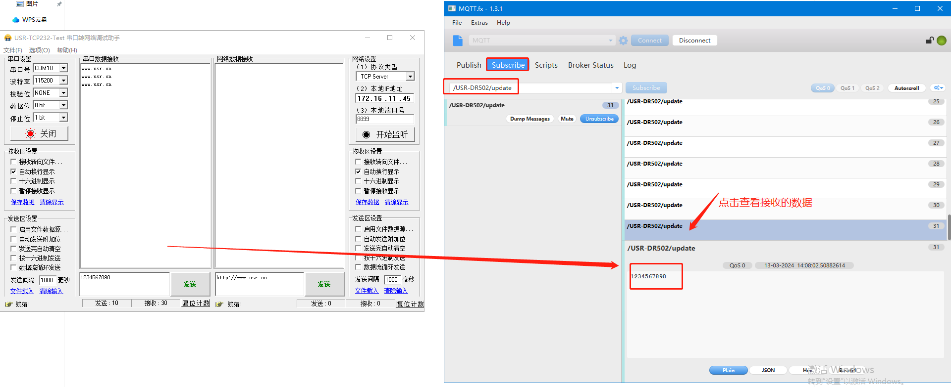 (3)串口助手發(fā)送框輸入數(shù)據(jù)1234567890,發(fā)送給MQTT.fx軟件,點(diǎn)擊MQTT.fx軟件的每一條/USR-DR502/update,可以看到接收的數(shù)據(jù)1234567890