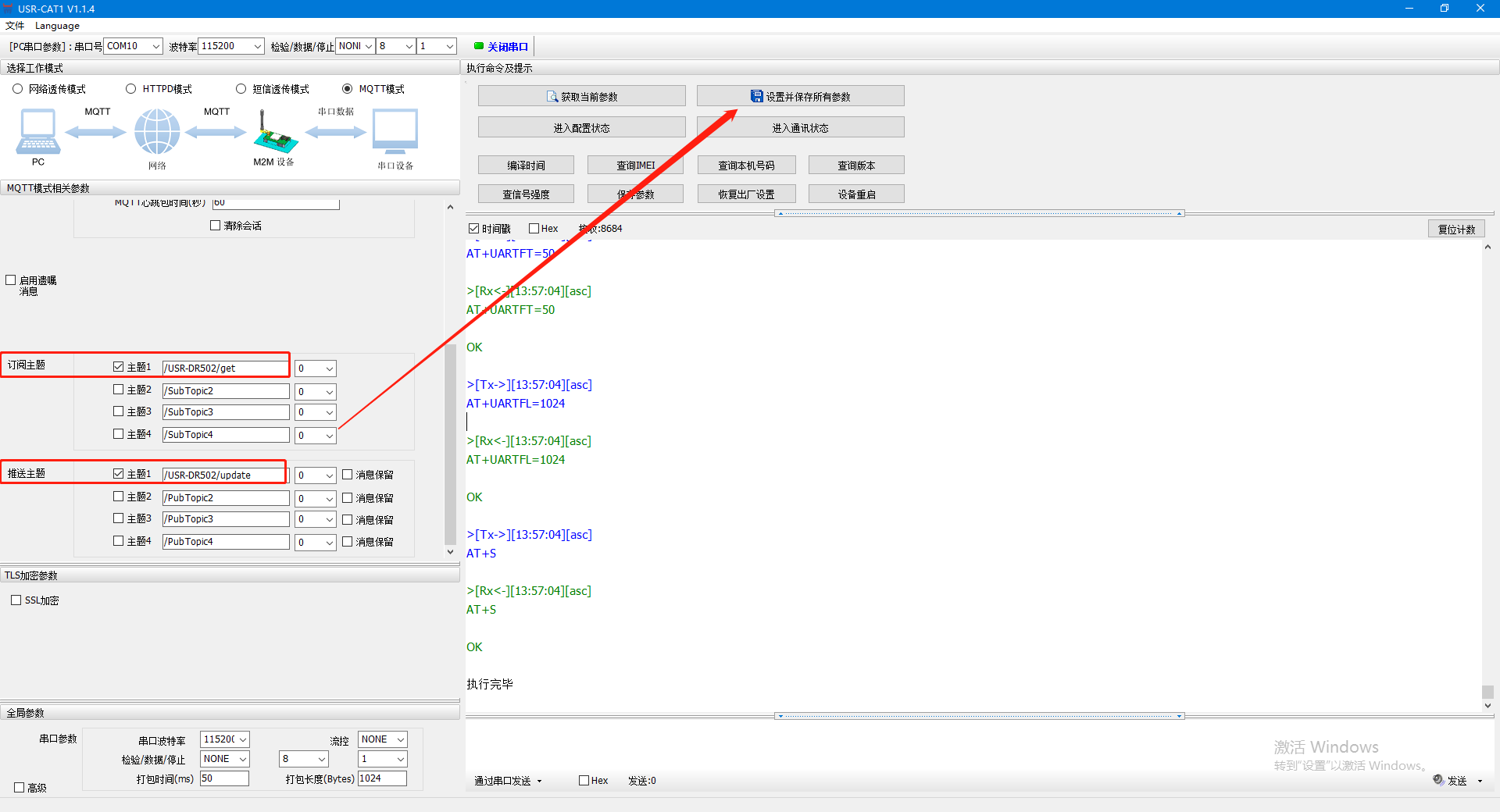 (8)推送主題:勾選主題1,填寫/USR-DR502/update