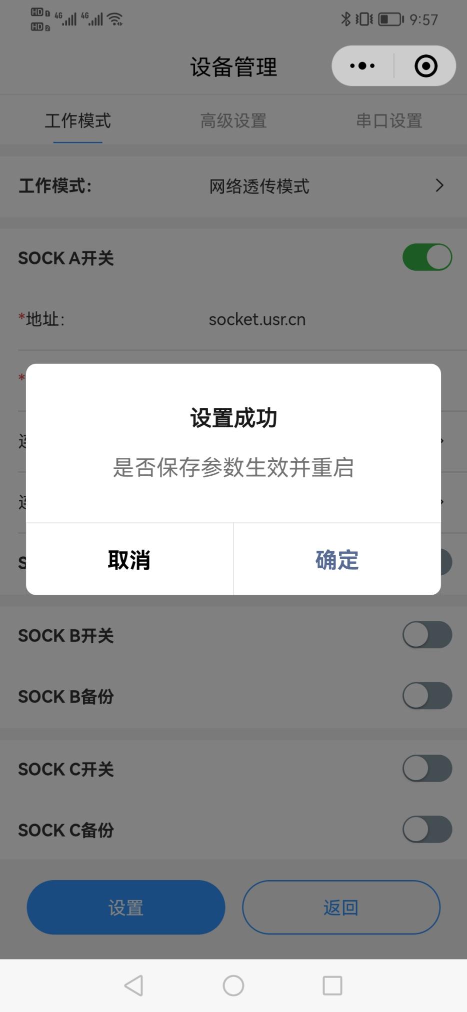 13、參數(shù)確認(rèn)完成之后,點(diǎn)擊聯(lián)博士配置工具的設(shè)置,提示設(shè)置成功,是否保存參數(shù)生效并重啟,點(diǎn)擊確定。USR-DR154參數(shù)設(shè)置并自動(dòng)重啟。