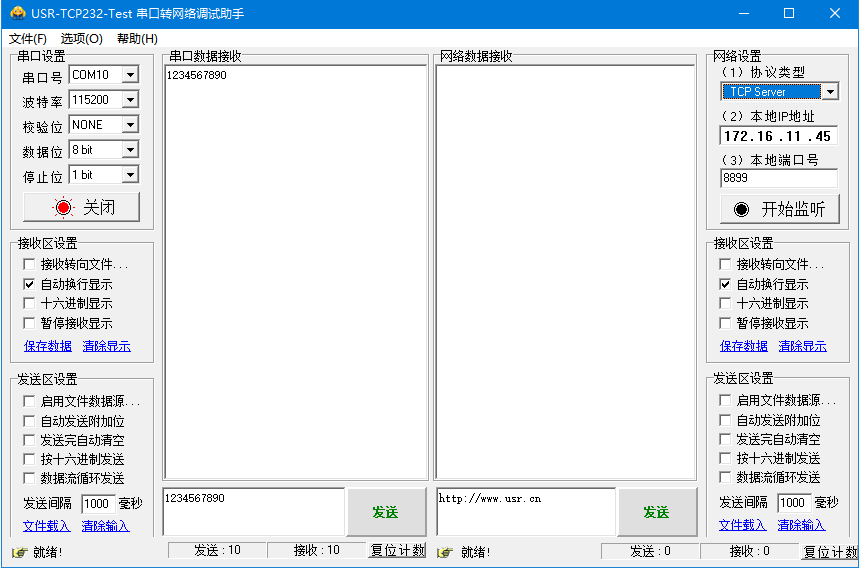 USR-DR154的485串口接USB-RS485串口線模擬485串口設(shè)備,打開串口助手COM10,串口參數(shù)和USR-DR154串口參數(shù)設(shè)置一致,發(fā)送1234567890給有人公司的測(cè)試服務(wù)器,測(cè)試服務(wù)器收到串口發(fā)送的數(shù)據(jù),會(huì)將數(shù)據(jù)返回給串口。