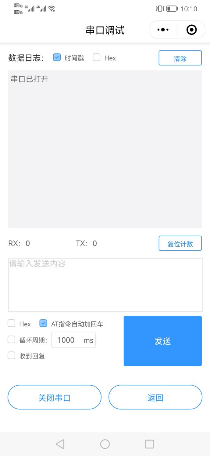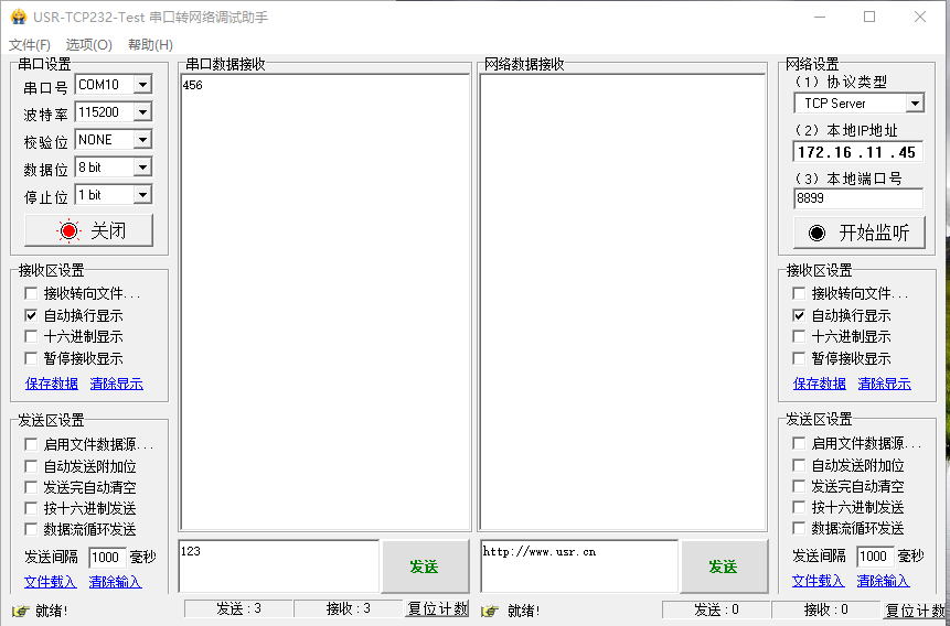 USR-DR154的485串口接USB-RS485串口線模擬485串口設備,打開串口助手COM10,串口參數(shù)和USR-DR154串口參數(shù)設置一致,發(fā)送123給手機小程序的串口調試,串口調試收到串口發(fā)送的數(shù)據(jù)123。