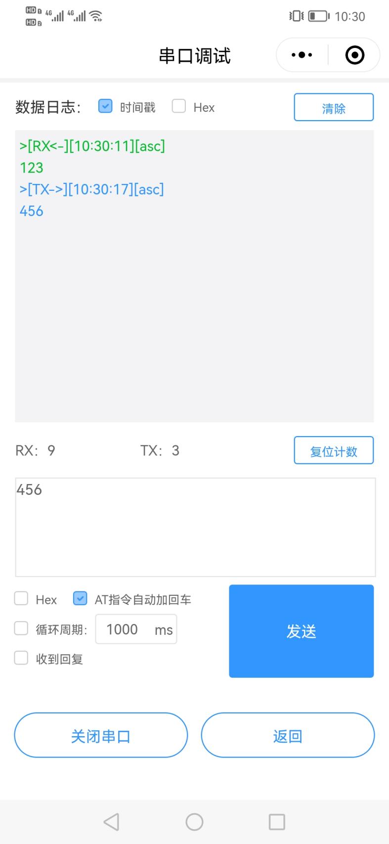 手機小程序的串口調試發(fā)送數(shù)據(jù)456給USR-DR154串口,串口助手收到數(shù)據(jù)456。