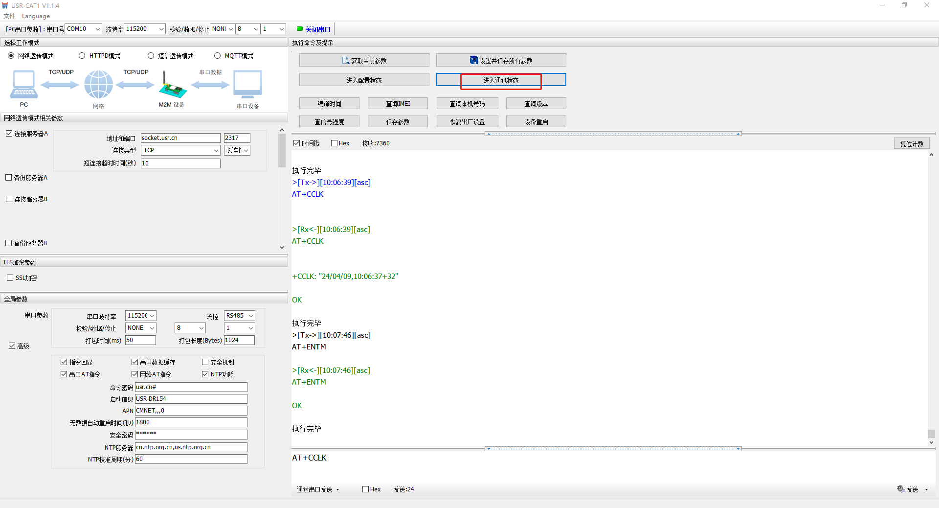 4、測(cè)試完NTP功能,設(shè)置軟件點(diǎn)擊進(jìn)入通訊狀態(tài)