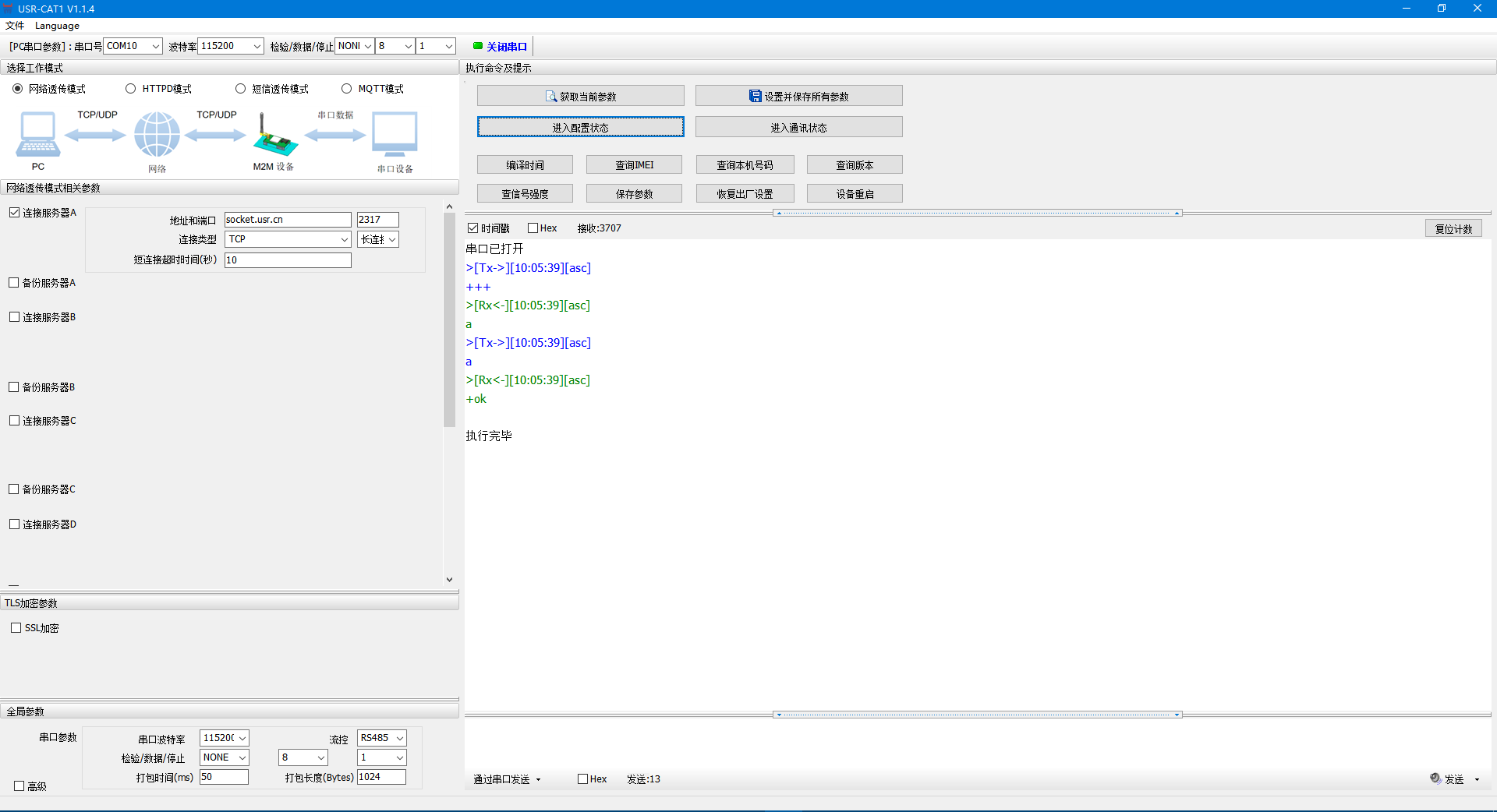 2、打開(kāi)USB-RS485串口線COM口,設(shè)置軟件波特率和USR-DR154波特率一致,點(diǎn)擊進(jìn)入配置狀態(tài)。
