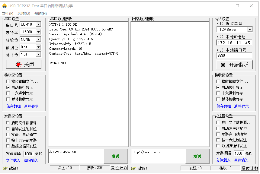4、USR-DR154串口發(fā)送數(shù)據(jù)data=1234567890到HTTPD測(cè)試服務(wù)器,HTTPD測(cè)試服務(wù)器返回?cái)?shù)據(jù)帶報(bào)頭到串口。