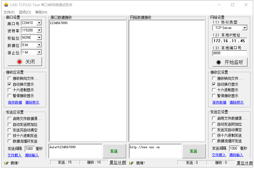 1、USR-DR154的485串口接USB-RS485串口線模擬485串口設(shè)備,打開(kāi)串口助手COM10,串口參數(shù)和USR-DR154串口參數(shù)設(shè)置一致。