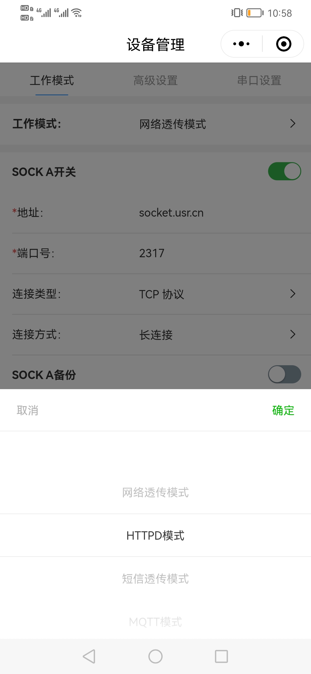 9、點(diǎn)擊工作模式,選擇HTTPD模式,點(diǎn)擊確定