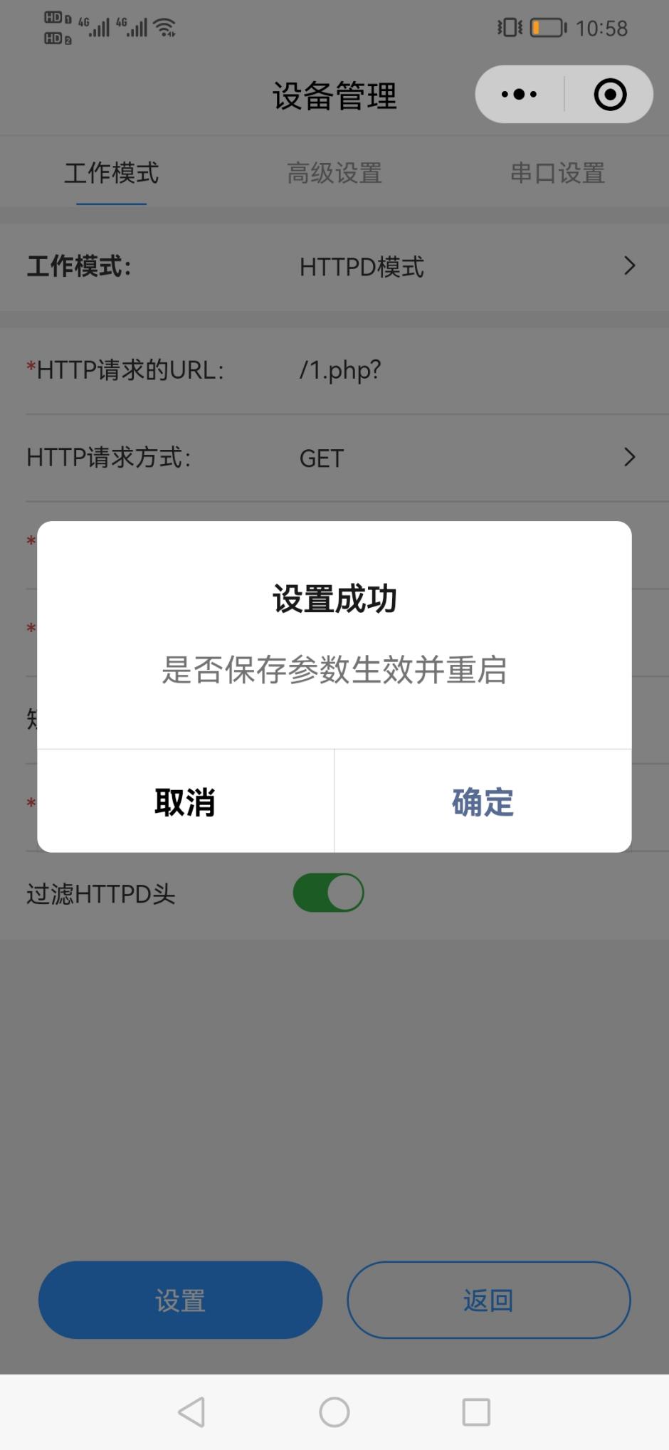 3、USR-DR154再次掃碼配置,關(guān)閉過(guò)濾HTTP頭,設(shè)置參數(shù)并自動(dòng)重啟。