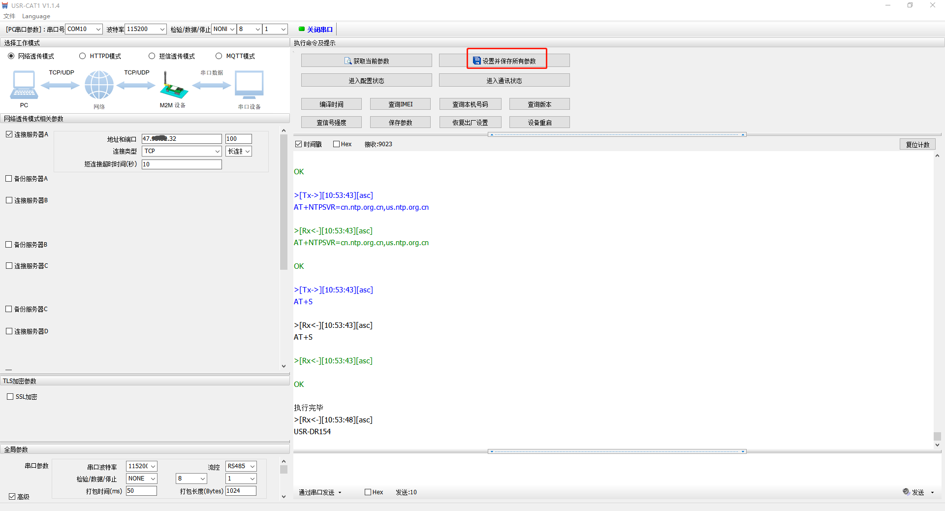 4、勾選連接服務(wù)器A,地址設(shè)置遠(yuǎn)程服務(wù)器IP,端口100,連接類型TCP,長連接。其他參數(shù)保持默認(rèn),點擊設(shè)置并保存所有參數(shù)。USR-DR154參數(shù)保存并重啟。