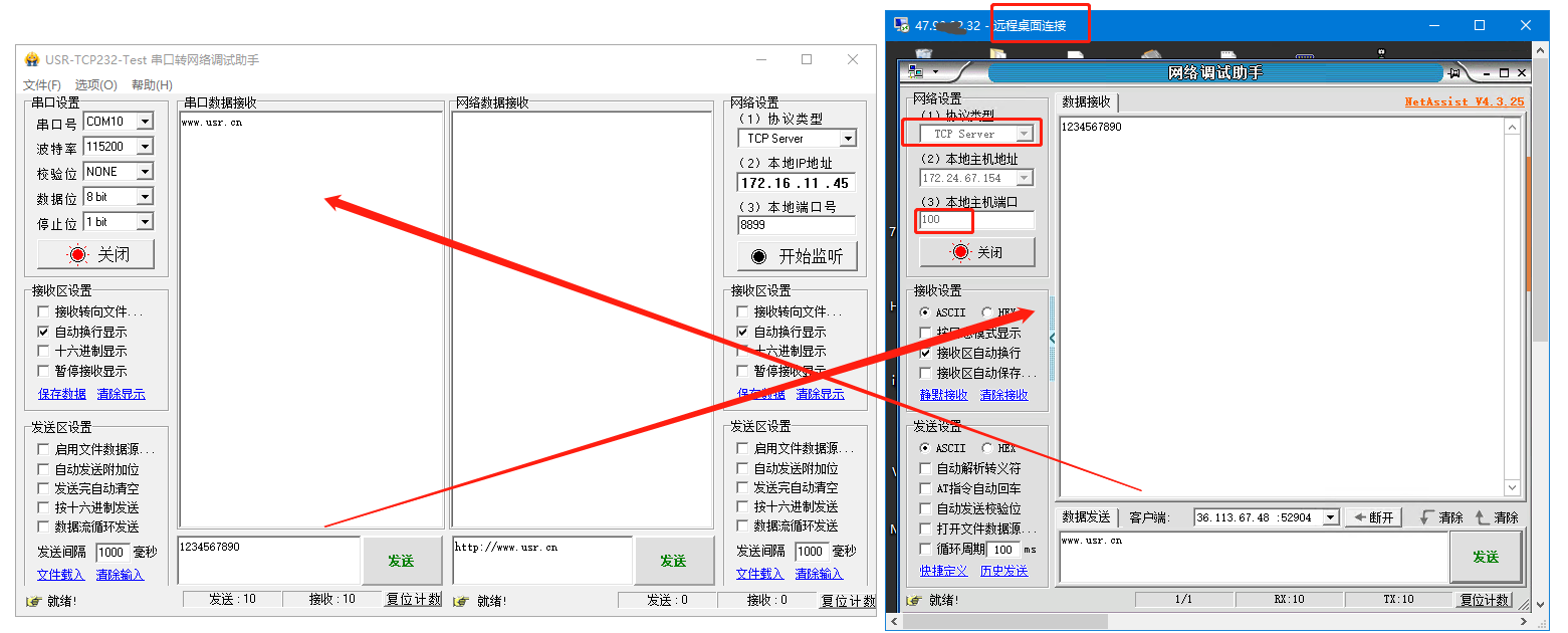 3、USR-DR154串口發(fā)送數(shù)據(jù)1234567890到遠(yuǎn)程服務(wù)器,遠(yuǎn)程服務(wù)器發(fā)送數(shù)據(jù)www.xyglz.cn到串口,可以實現(xiàn)串口和網(wǎng)絡(luò)之間的數(shù)據(jù)雙向通訊。