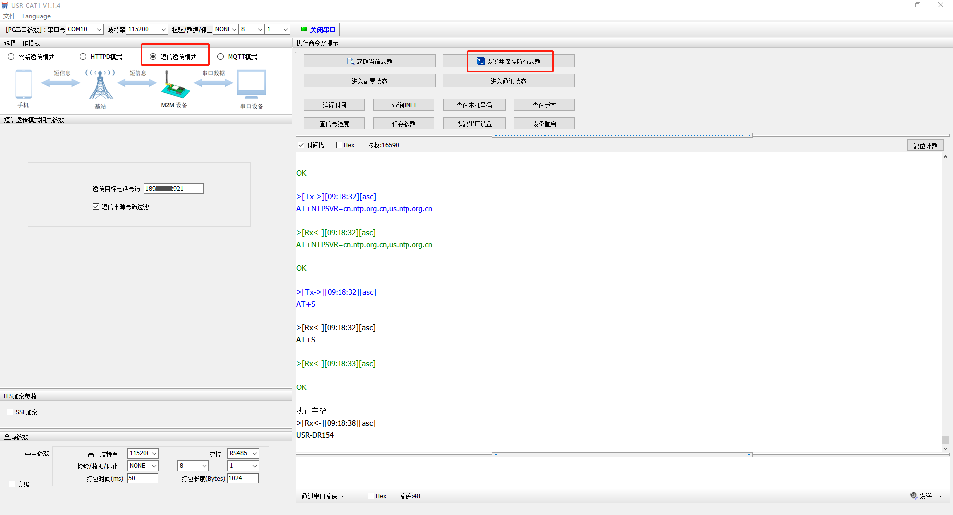 4、勾選短信透傳模式,輸入透傳目標電話號碼,點擊設(shè)置并保存所有參數(shù)。USR-DR154參數(shù)保存并重啟。