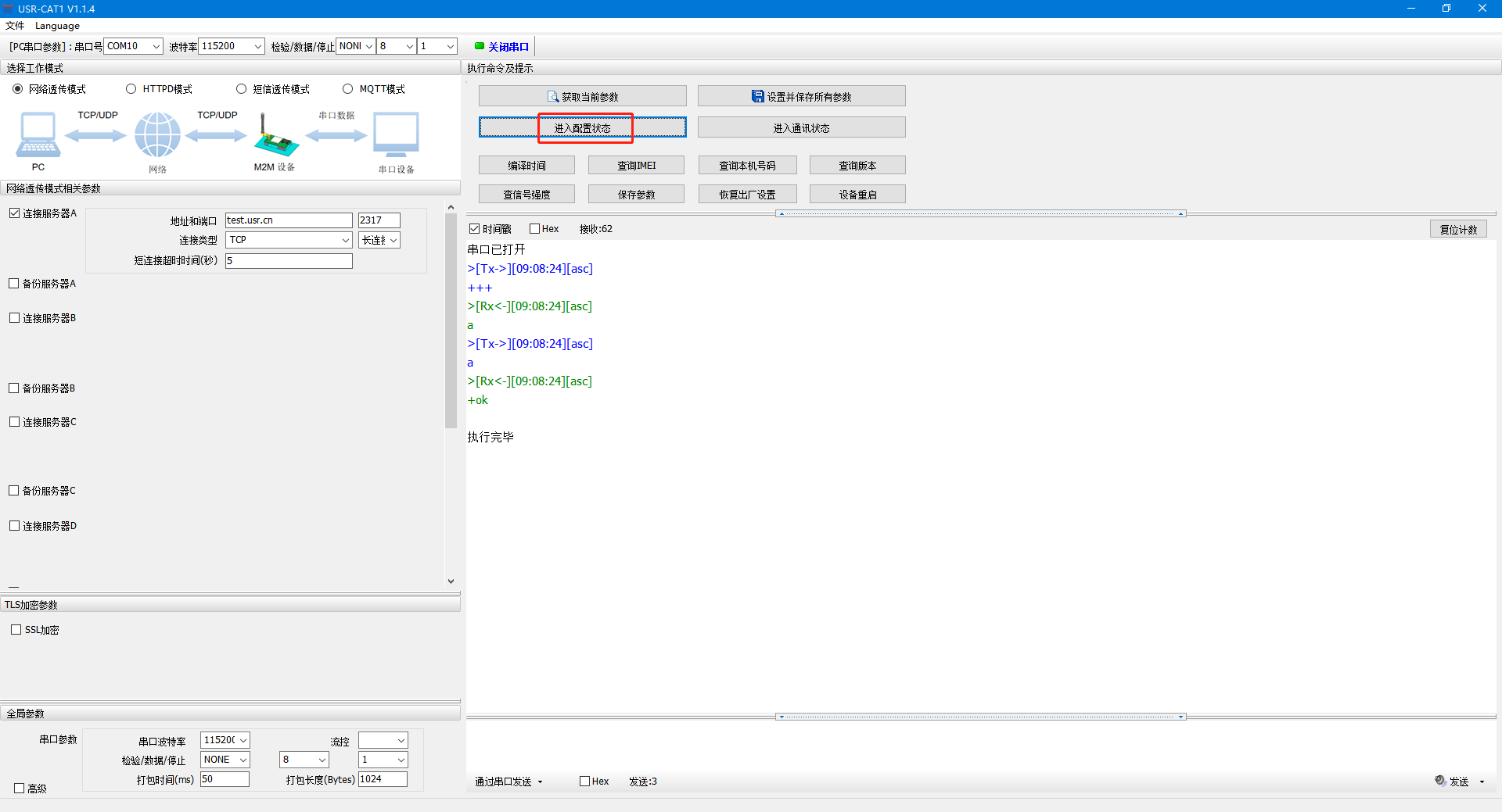 2、打開USB-RS485串口線COM口,設(shè)置軟件波特率和USR-DR154波特率一致,點擊進入配置狀態(tài)。