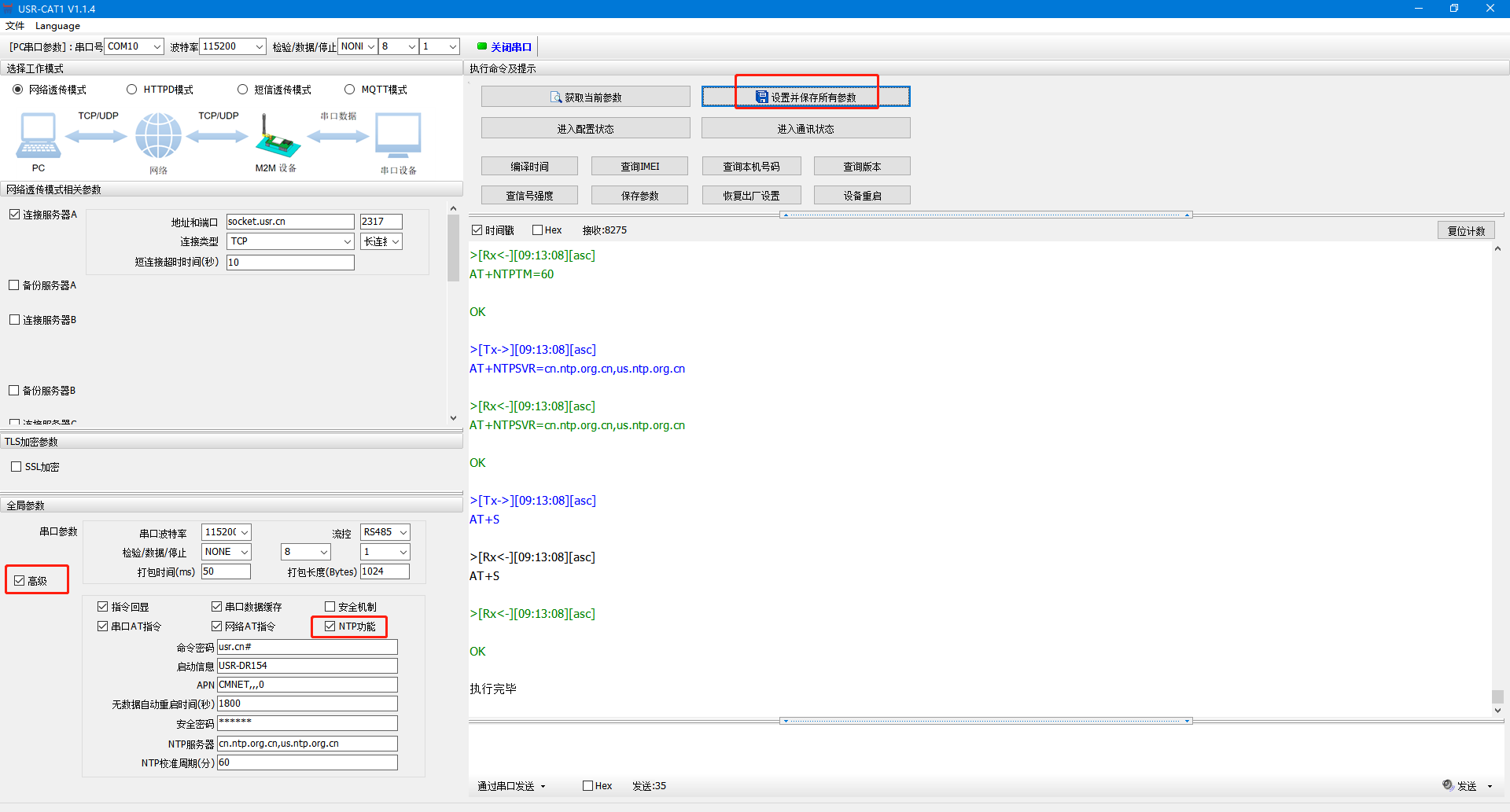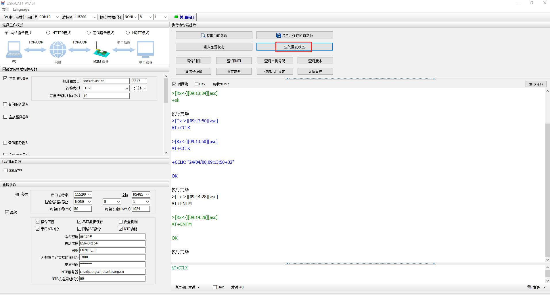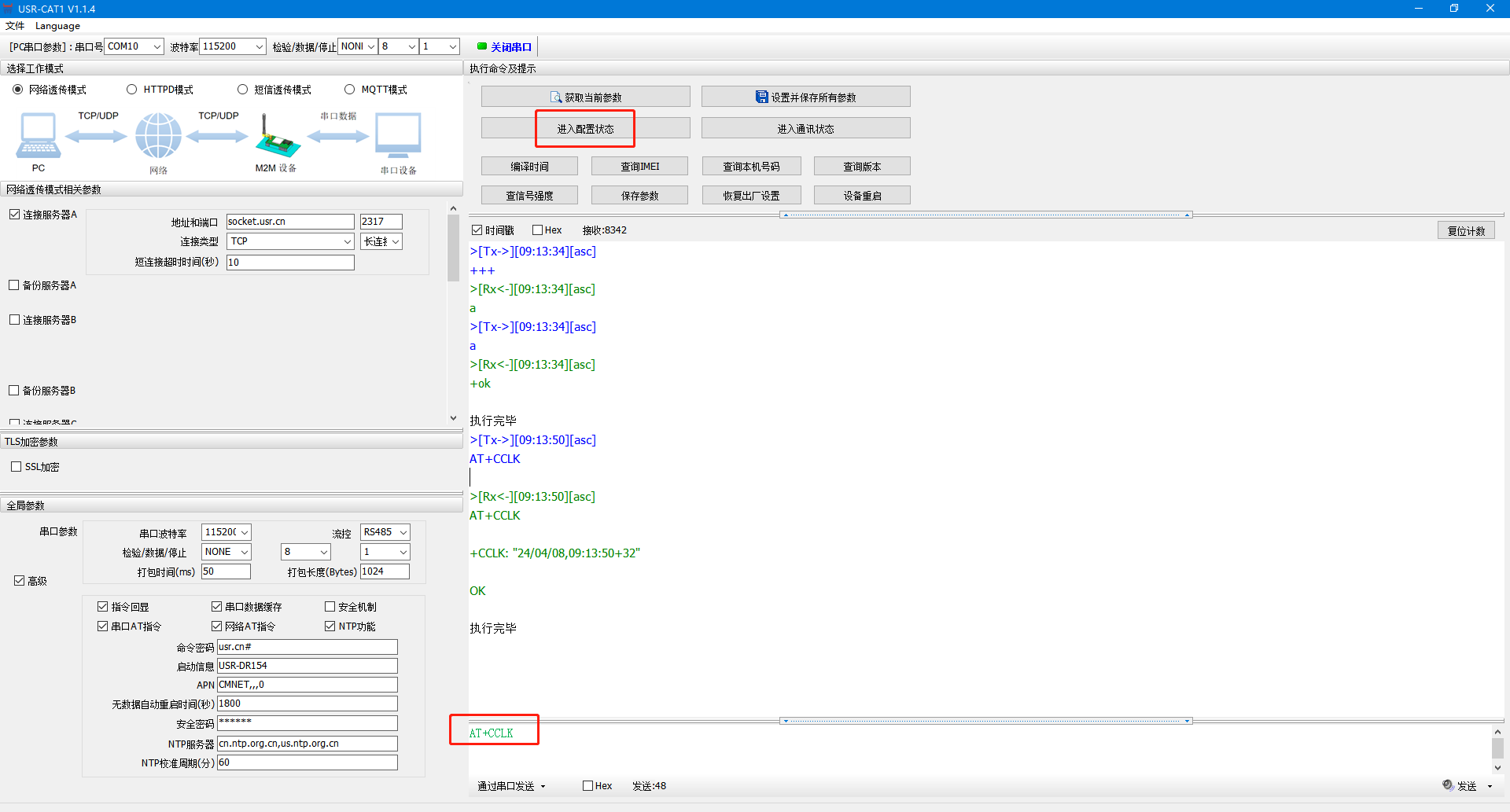 1、USR-DR154的485串口接USB-RS485串口線模擬485串口設(shè)備,打開設(shè)置軟件,點擊進入配置狀態(tài),發(fā)送區(qū)輸入AT+CCLK?后面帶回車換行發(fā)送,接收數(shù)據(jù)返回當(dāng)前時間。