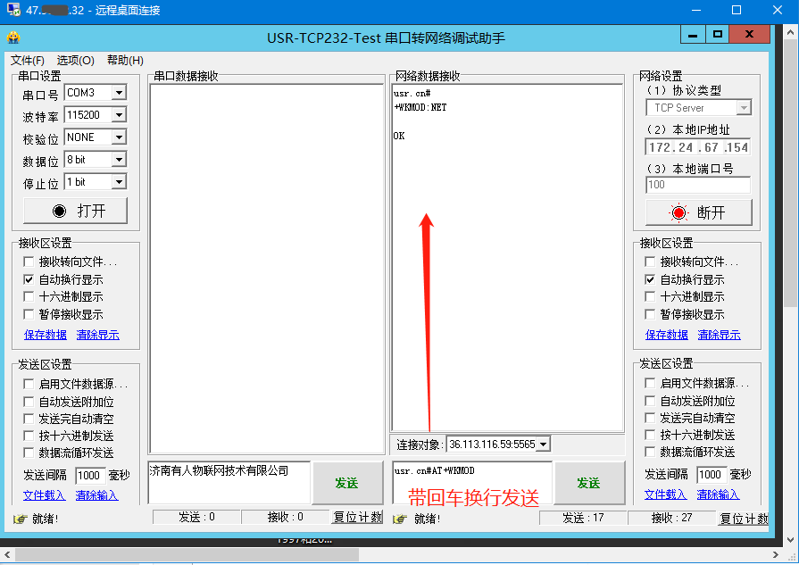 網(wǎng)絡(luò)助手發(fā)送區(qū),發(fā)送usr.cn#AT+WKMOD,后面帶回車換行發(fā)送,網(wǎng)絡(luò)端可以查詢到工作模式。
