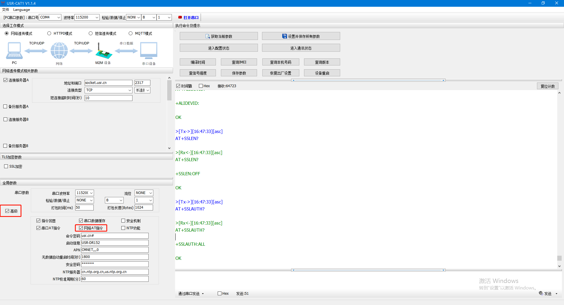 4、勾選高級,查看網(wǎng)絡(luò)AT指令是否開啟,需要勾選網(wǎng)絡(luò)AT指令。(默認(rèn)是開啟的)