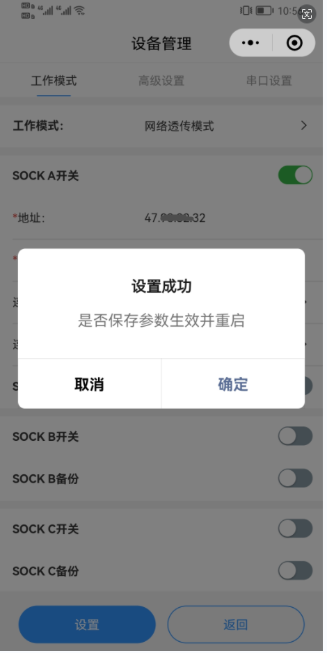 14、參數(shù)確認(rèn)完成之后,點擊聯(lián)博士配置工具的設(shè)置,提示設(shè)置成功,是否保存參數(shù)生效并重啟,點擊確定。USR-DR152參數(shù)設(shè)置并自動重啟。