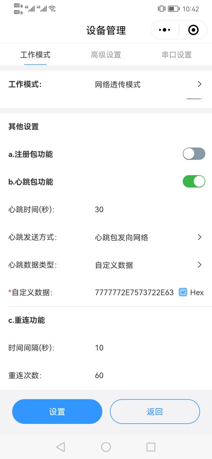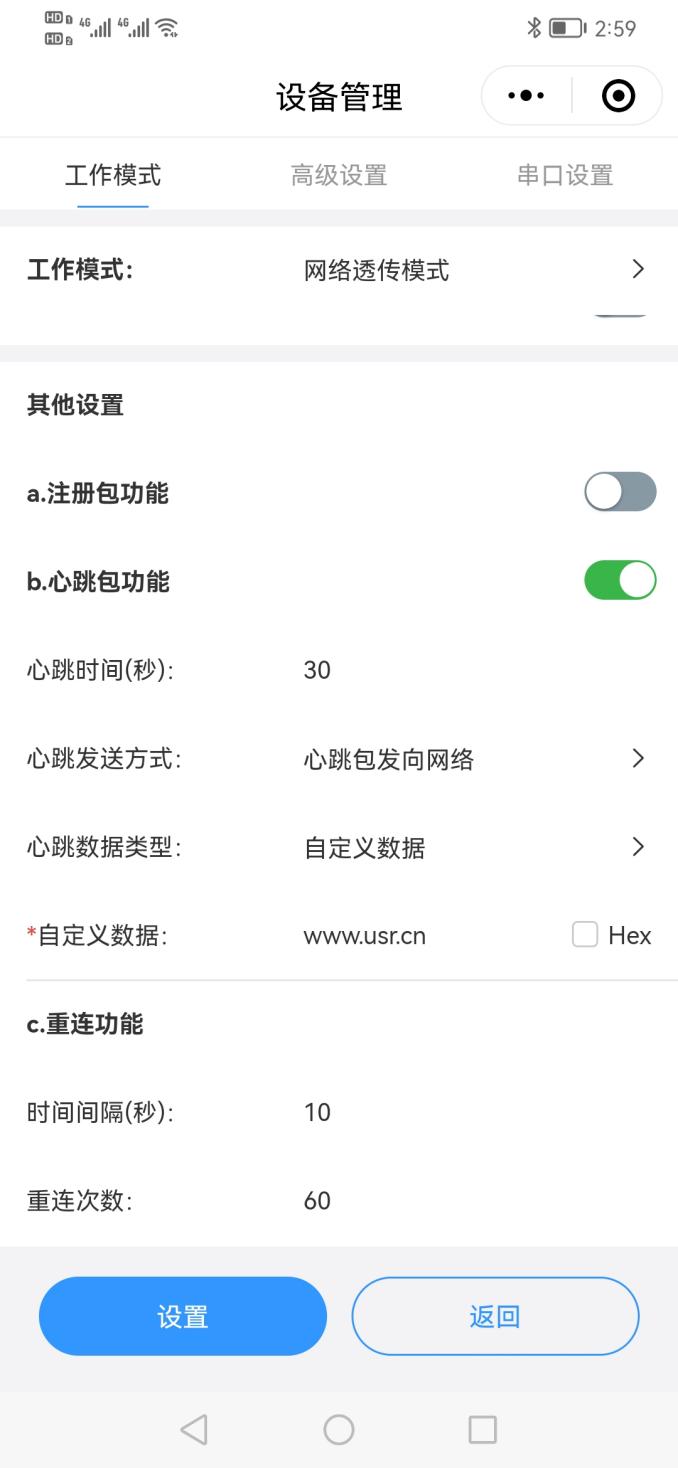11、在工作模式這個頁面,下拉滾動條,查看其他設(shè)置,心跳包功能開啟,心跳時間(秒)默認(rèn)是30S,心跳發(fā)送方式是心跳包發(fā)向網(wǎng)絡(luò),心跳數(shù)據(jù)類型選擇自定義數(shù)據(jù),自定義數(shù)據(jù)默認(rèn)是Hex顯示是77 77 77 2E 75 73 72 2E 63 6E,ASCII顯示是www.xyglz.cn