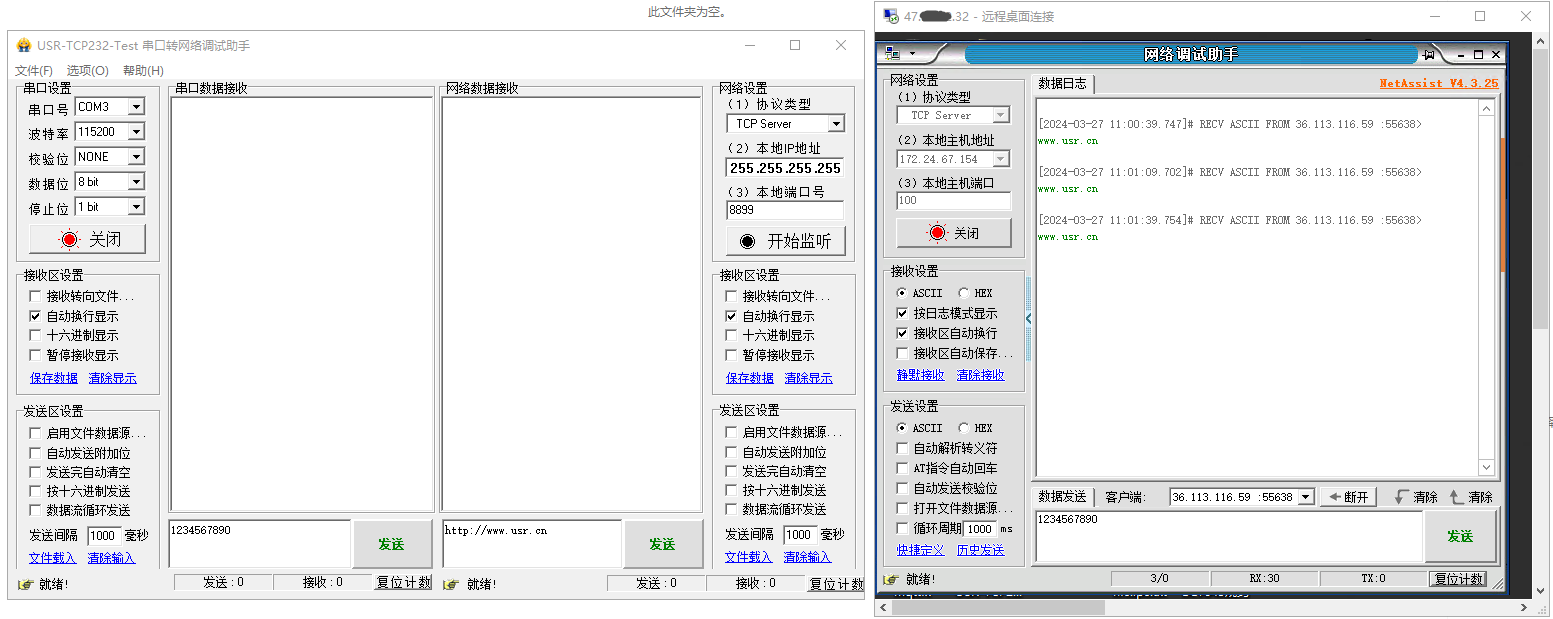 登陸遠(yuǎn)程桌面連接,打開一個網(wǎng)絡(luò)助手,協(xié)議類型TCP server,服務(wù)器IP,本地端口100和DR152一樣,點擊連接。