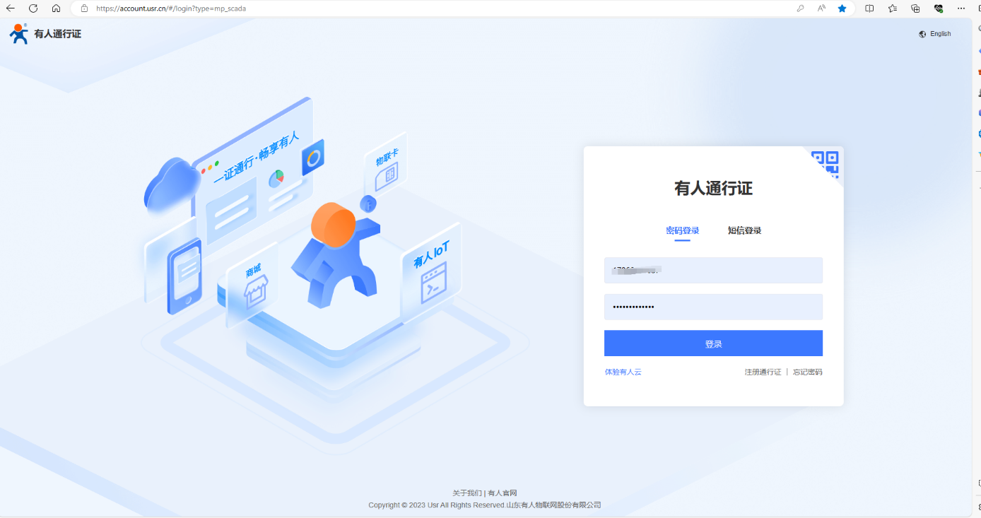 登錄有人云平臺:https://account.usr.cn/#/login?type=mp_scada