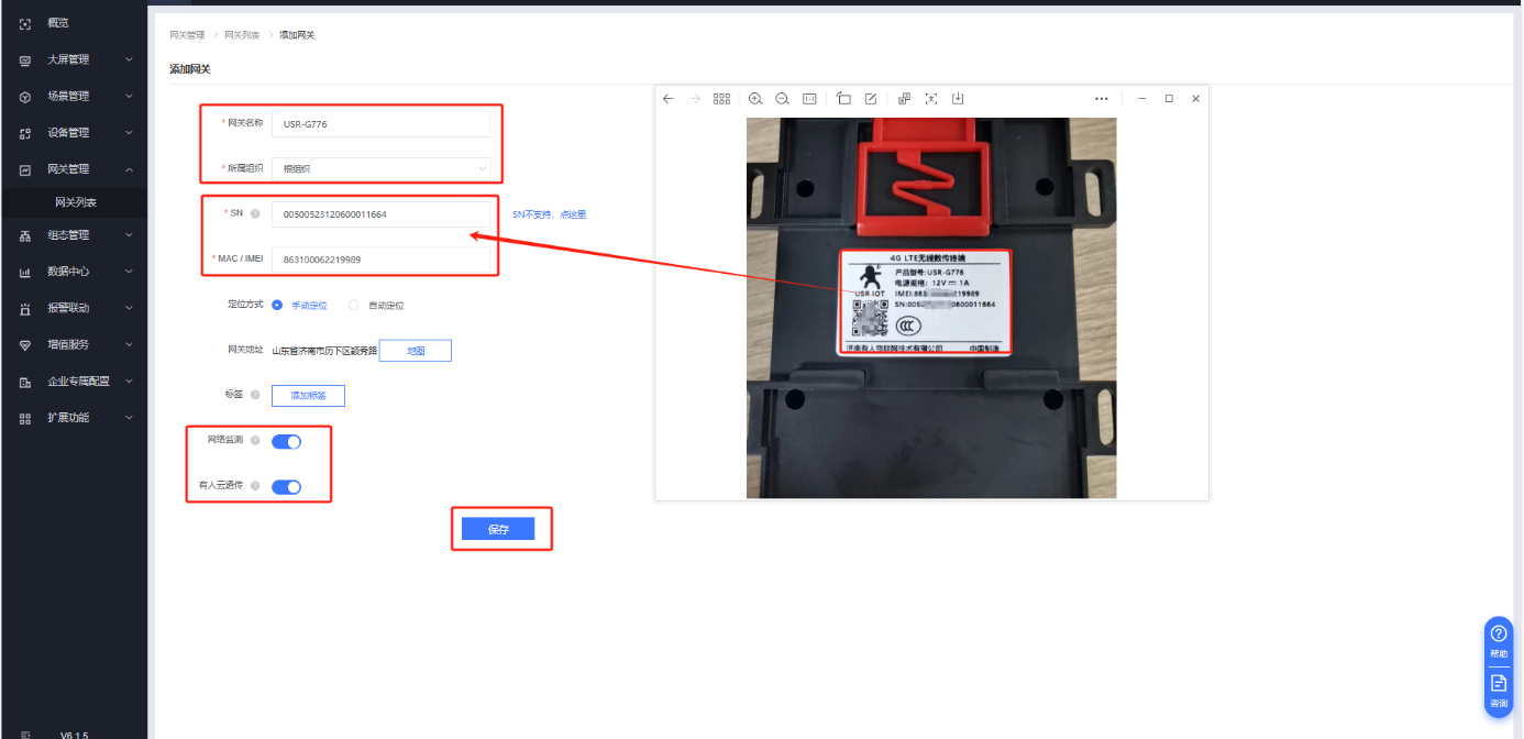 填入名稱,選擇跟組織,填入USR-G776 背面的SN和IMEI ,開啟有人云透傳功能