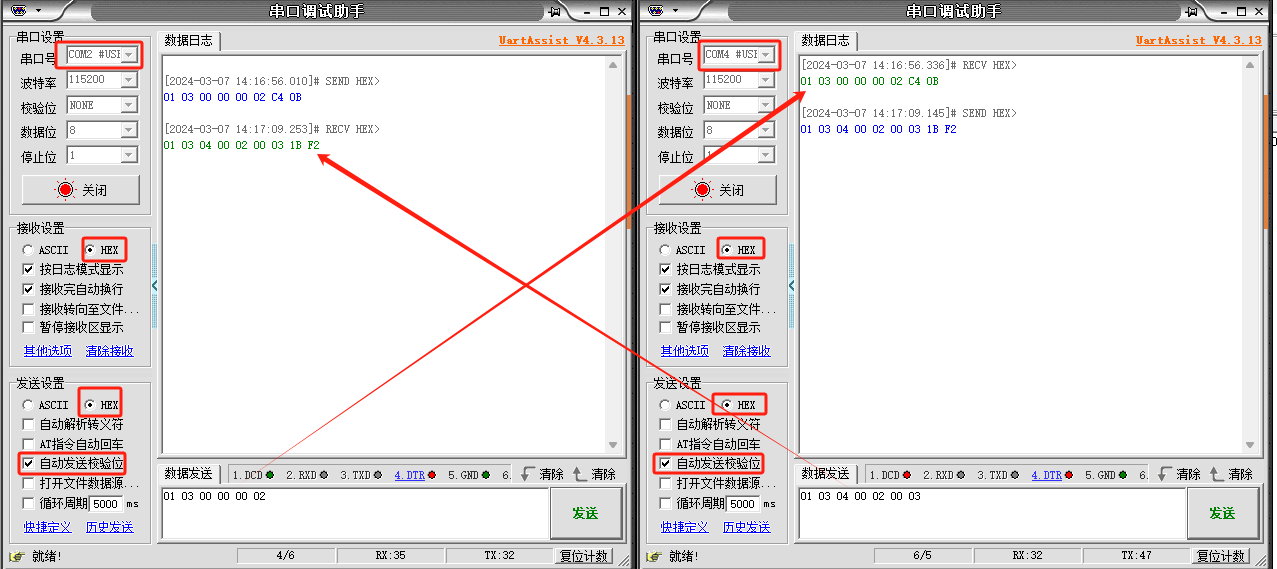 打開兩個串口調(diào)試助手分別引用CO4和COM2,進(jìn)行數(shù)據(jù)互發(fā)測試。