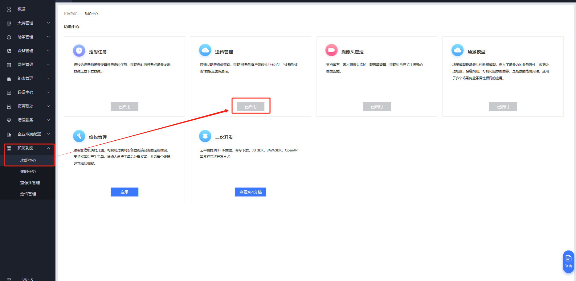 有人云---擴(kuò)展功能---功能中心---啟用透傳管理