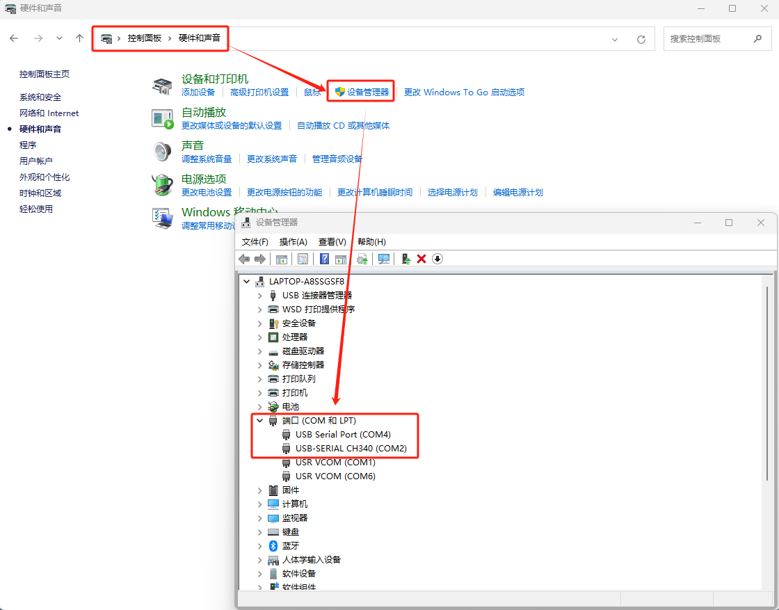 電腦打開控制面本---硬件和聲音---設(shè)備管理器---COM和LPT,可以看到兩個轉(zhuǎn)換器的COM口分別是COM4和COM2