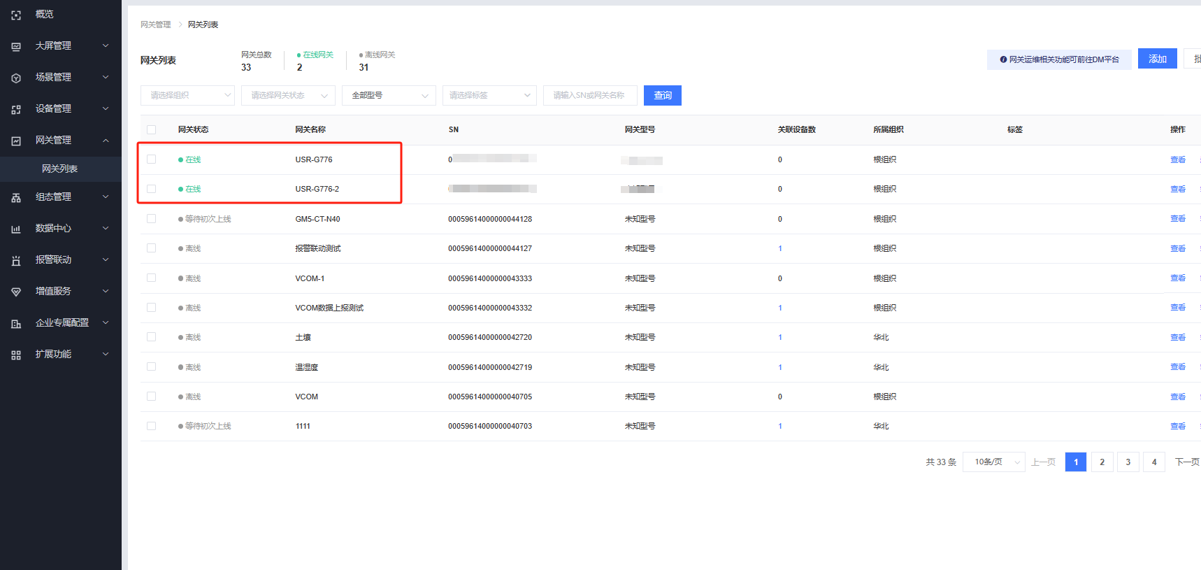 給USR-G776插入SIM卡,接入天線和電源,即可看到USR-G776在有人云在線。