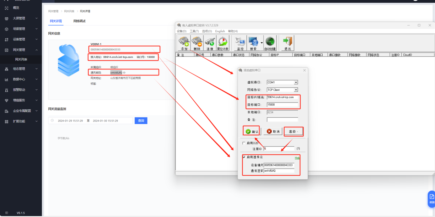 打開虛擬串口軟件,創(chuàng)建虛擬串口,填入有人云給虛擬串口分配的ID、密碼和接入地址、端口號,點擊確定