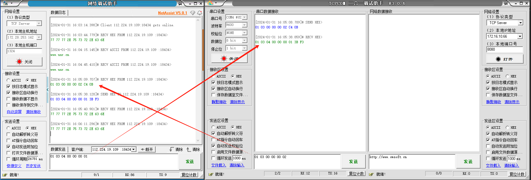 遠(yuǎn)程桌面上網(wǎng)絡(luò)調(diào)試助手監(jiān)聽到設(shè)備接入,打開有人網(wǎng)絡(luò)串口調(diào)試助手二合一軟件進(jìn)行網(wǎng)絡(luò)端和串口端數(shù)據(jù)交互測(cè)試,串口端發(fā)送01 03 00 00 00 02 C4 0B,網(wǎng)絡(luò)端接收到報(bào)文;網(wǎng)絡(luò)端發(fā)送01 03 04 00 00 00 01 3B F3,串口端可以收到報(bào)文。