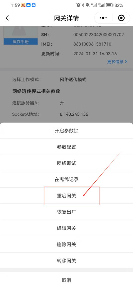 設(shè)置好相關(guān)參數(shù)后,點(diǎn)擊管理,重啟網(wǎng)關(guān),等待網(wǎng)關(guān)重新上線重啟成功。