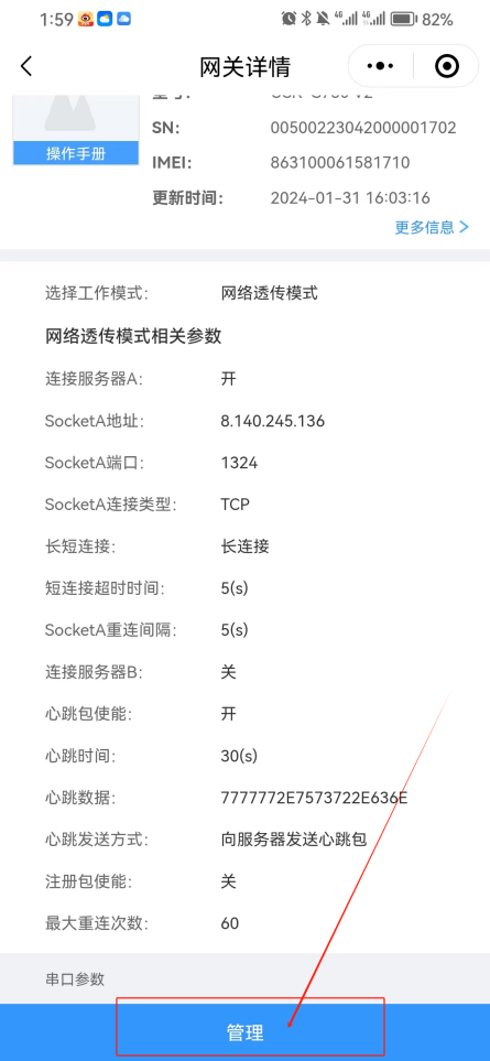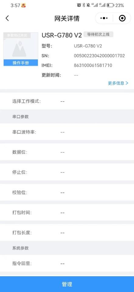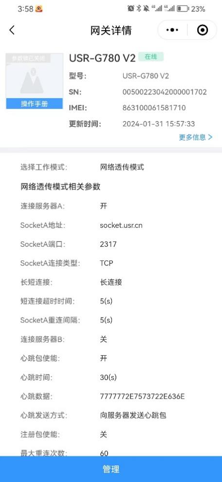 設(shè)備添加成功,給設(shè)備上電,插上物聯(lián)卡和天線,等待幾分可以看到780 V2上線,點(diǎn)擊管理去配置780 V2要連接的服務(wù)器信息。
