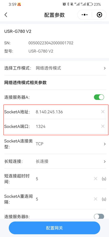 USR-G780 V2可以通過手機(jī)微信掃碼進(jìn)行參數(shù)配置對(duì)接遠(yuǎn)程服務(wù)器,并進(jìn)行數(shù)據(jù)通訊測(cè)試。