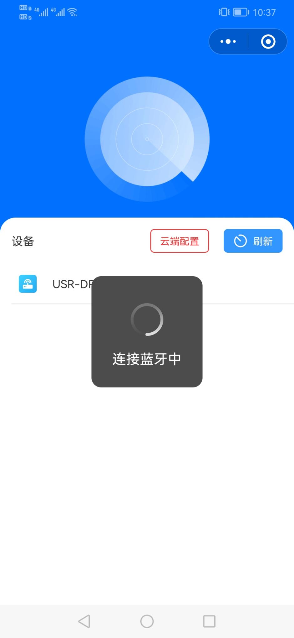 微信小程序“聯(lián)博士配置工具”自動掃描手機旁邊的 DTU 設(shè)備,其中每一臺設(shè)備都有不同的藍(lán)牙名稱,該藍(lán)牙名稱為“USR-DR15X- 設(shè)備 IMEI 號后六位”,便于用戶可以正常識別該配置哪一臺 DTU 設(shè)備。