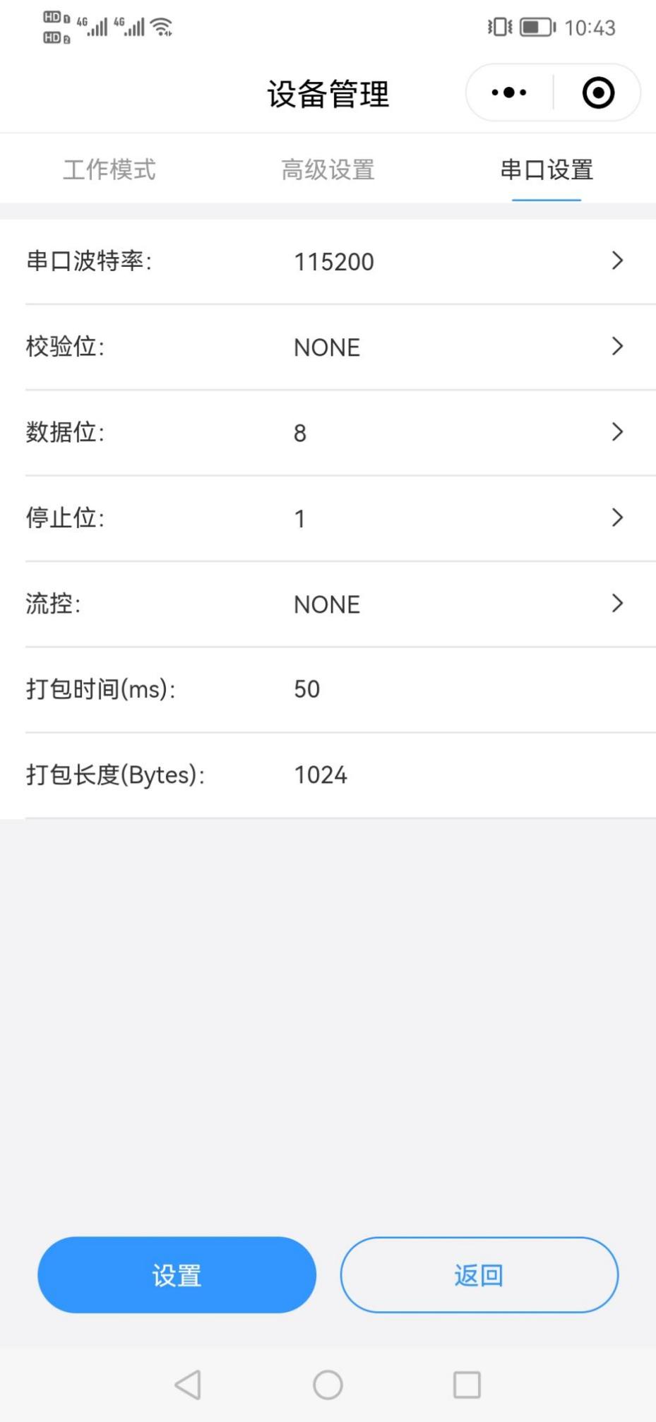 11、點擊串口設(shè)置,查看串口波特率115200,實際測試需要修改USR-DR152的波特率,改的和所接232串口設(shè)備一致,其他參數(shù)保持默認(rèn)。