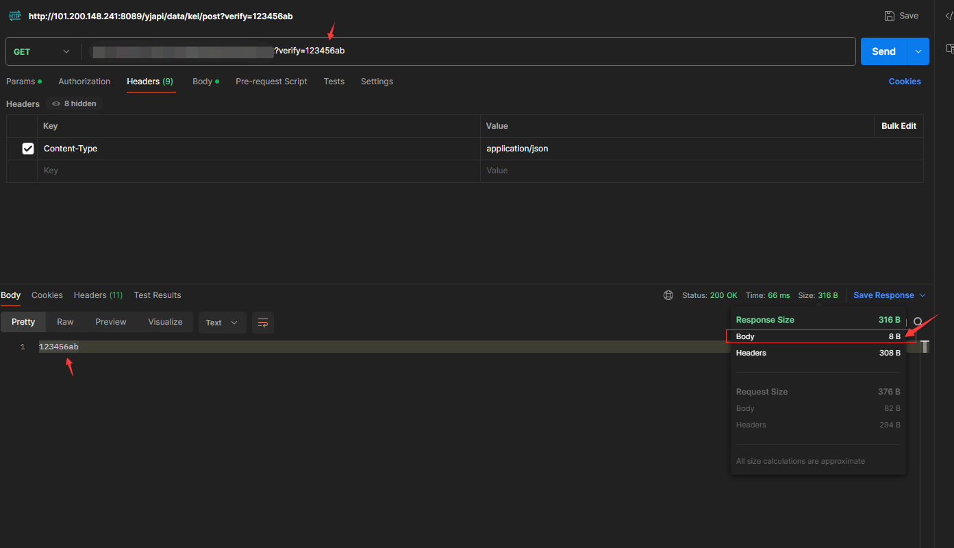 將填寫的URL復(fù)制進postman后面+?verify=123456ab 藍色的8個字節(jié)可隨意更換測試