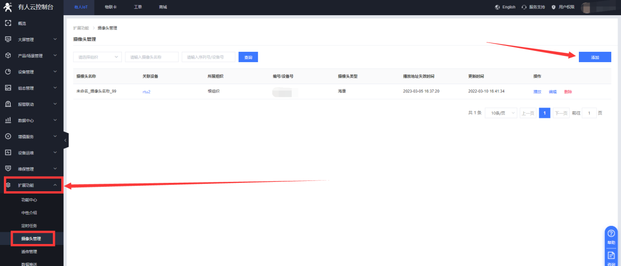(1)登陸有人云平臺后在左側 擴展功能-功能中心 中開通《攝像頭管理》功能,便可在下拉列表中找到該功能,點擊并選擇添加一個攝像頭