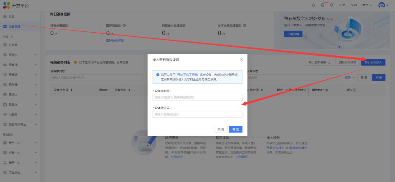 (2)在彈出的對話框中寫入攝像頭標簽上的序列號與驗證碼,點確定