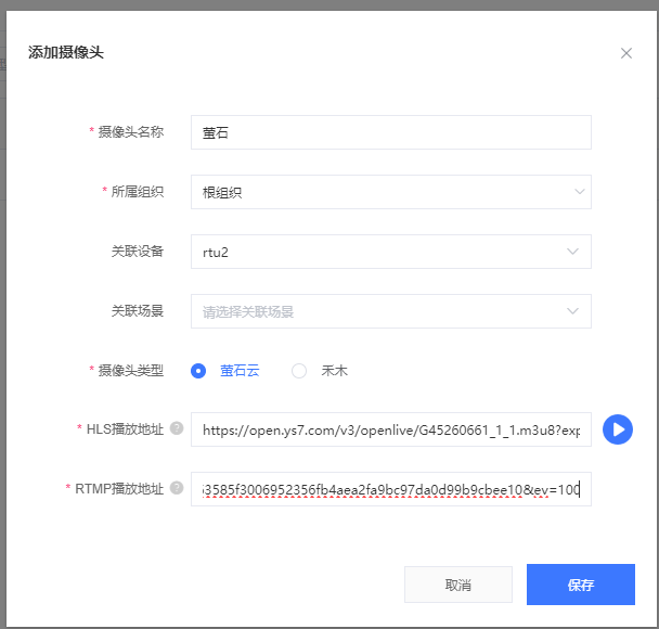 (2)目前支持可接入螢石云平臺的??禂z像頭,設置攝像頭的名稱,將之前查找到的HLS地址與RTMP地址復制到播放地址中,點擊后面的藍色播放按鈕可預覽畫面,選擇所屬組織,可選擇需要掛載在哪個設備下面,點保存。