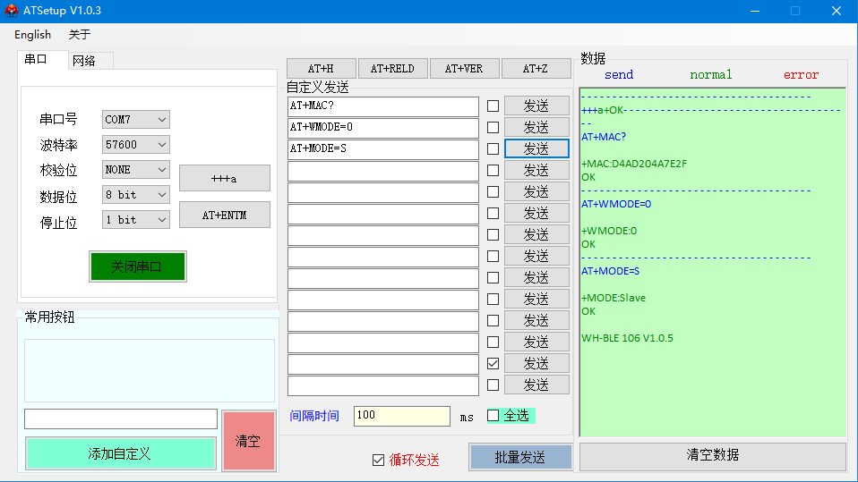 軟件串口打開另一塊BLE106 com口:波特率 57600、無校驗(yàn)、8 位數(shù)據(jù)位、1 位停止位。