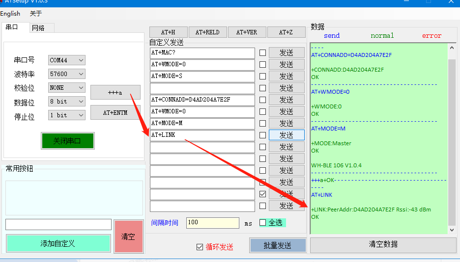 模塊啟動(dòng)后可使用發(fā)送link指令可查詢是否連接成功:AT+LINK