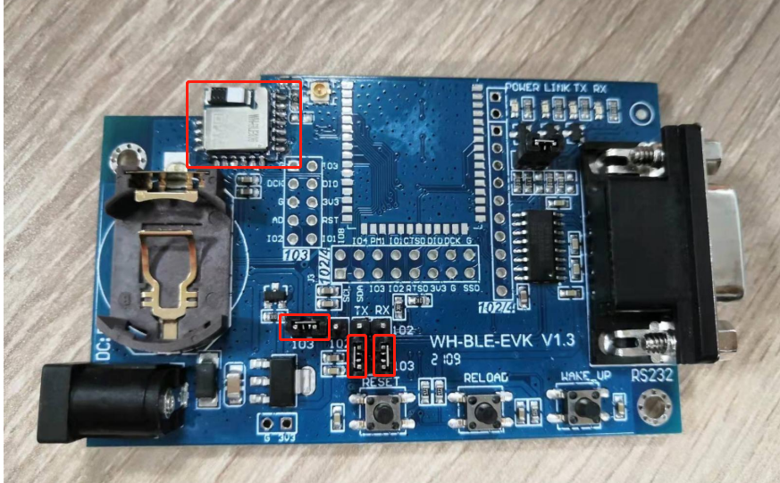 WH-BLE106分別焊接到WH-BLE-EVK測(cè)試底板,將底板跳帽改到103位置。